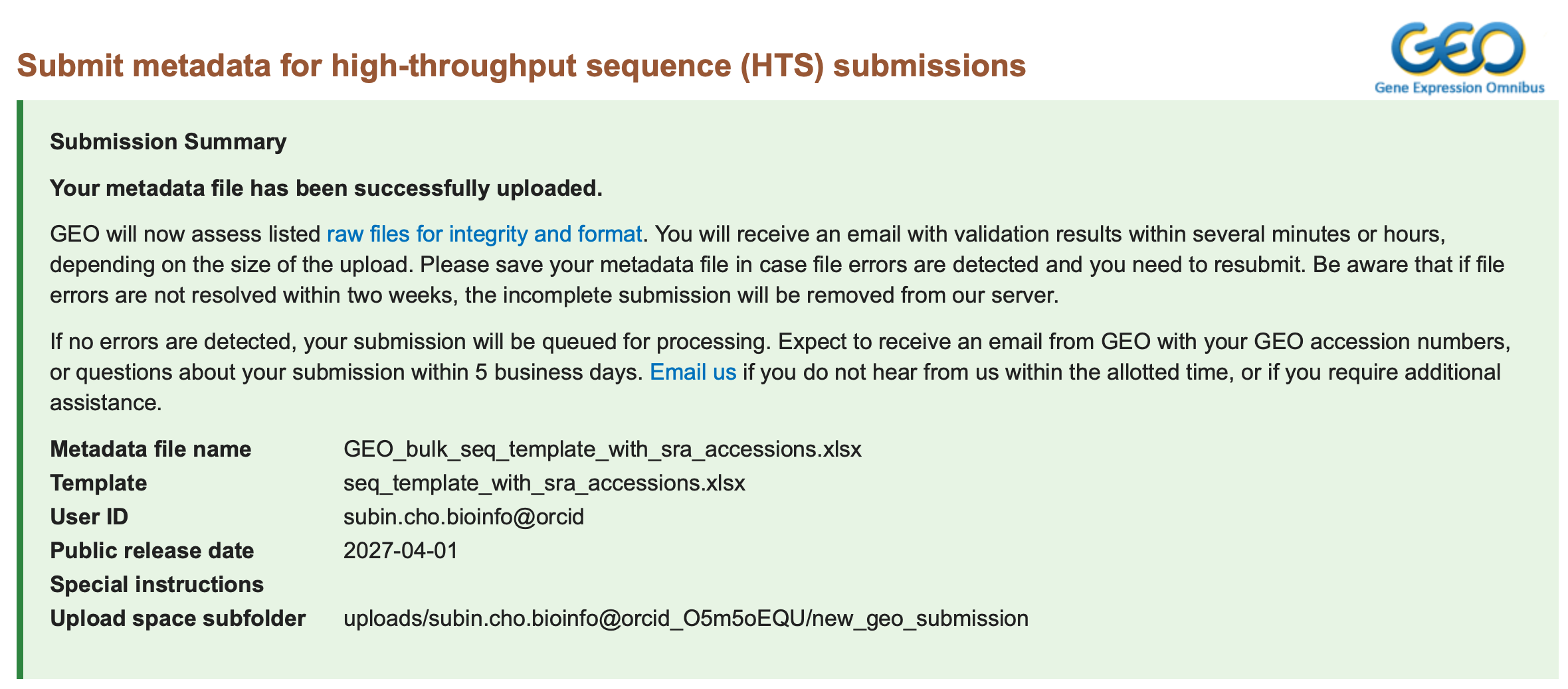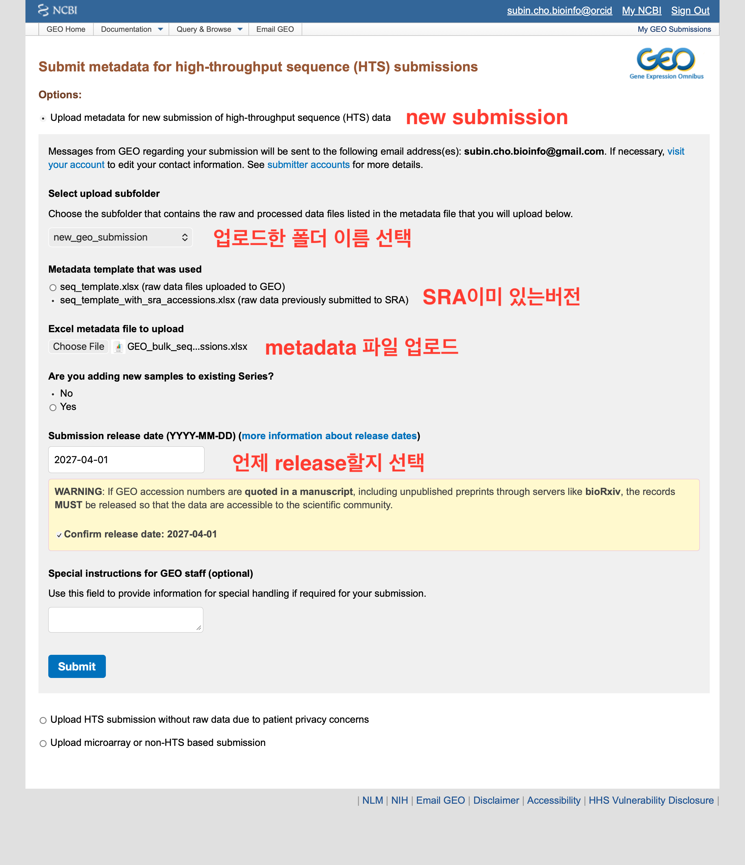 GEO data submission: SRA에 미리 제출한 상황